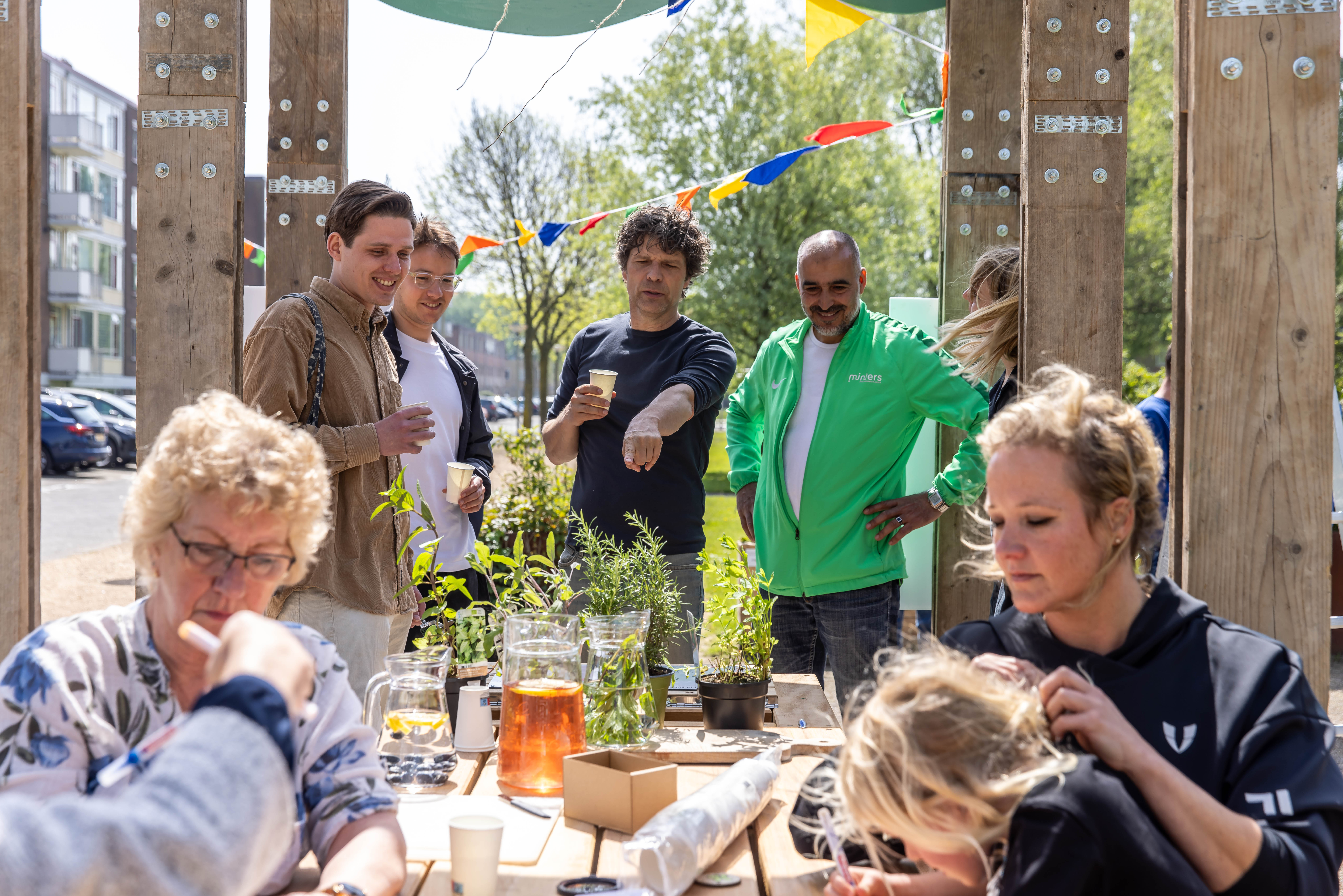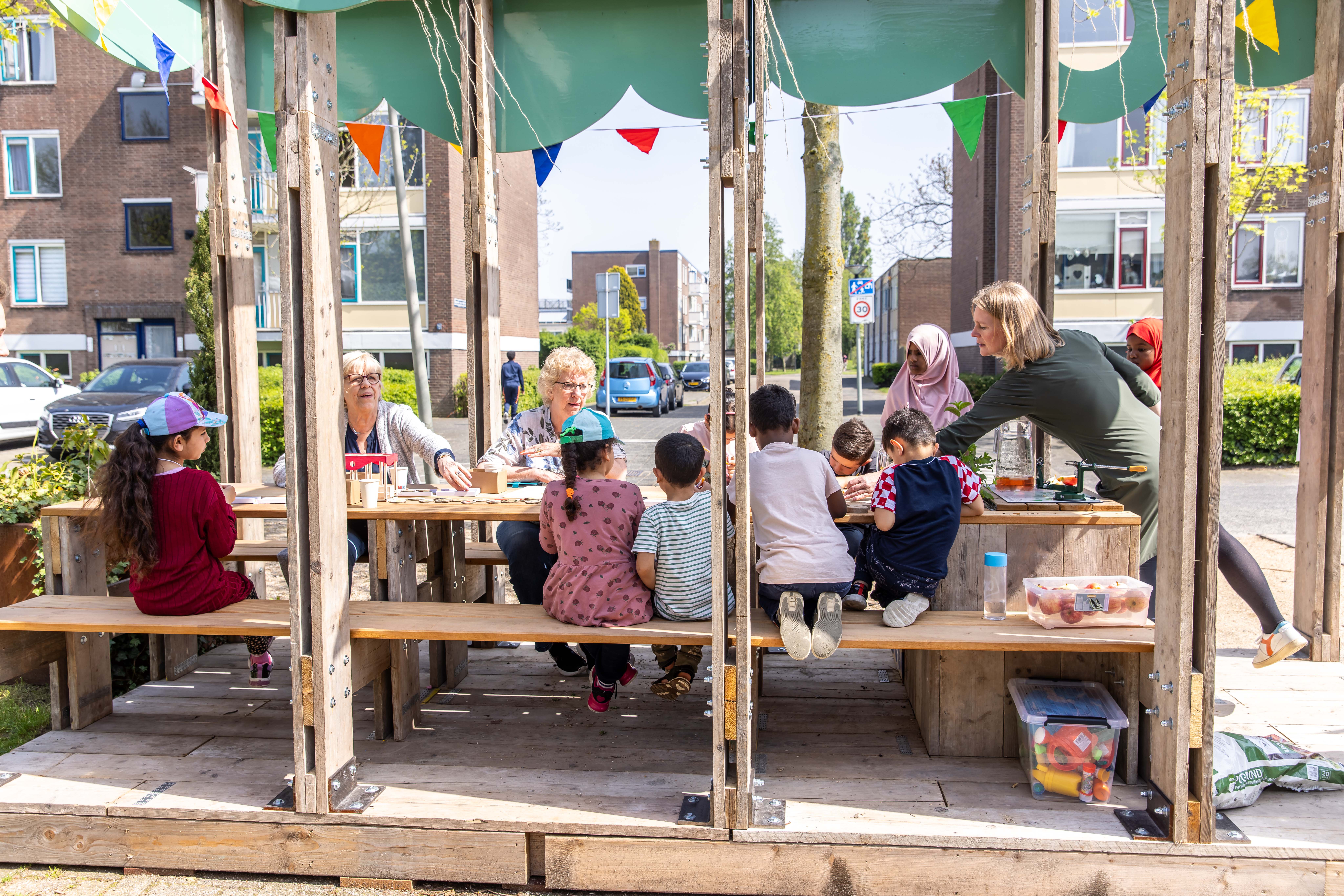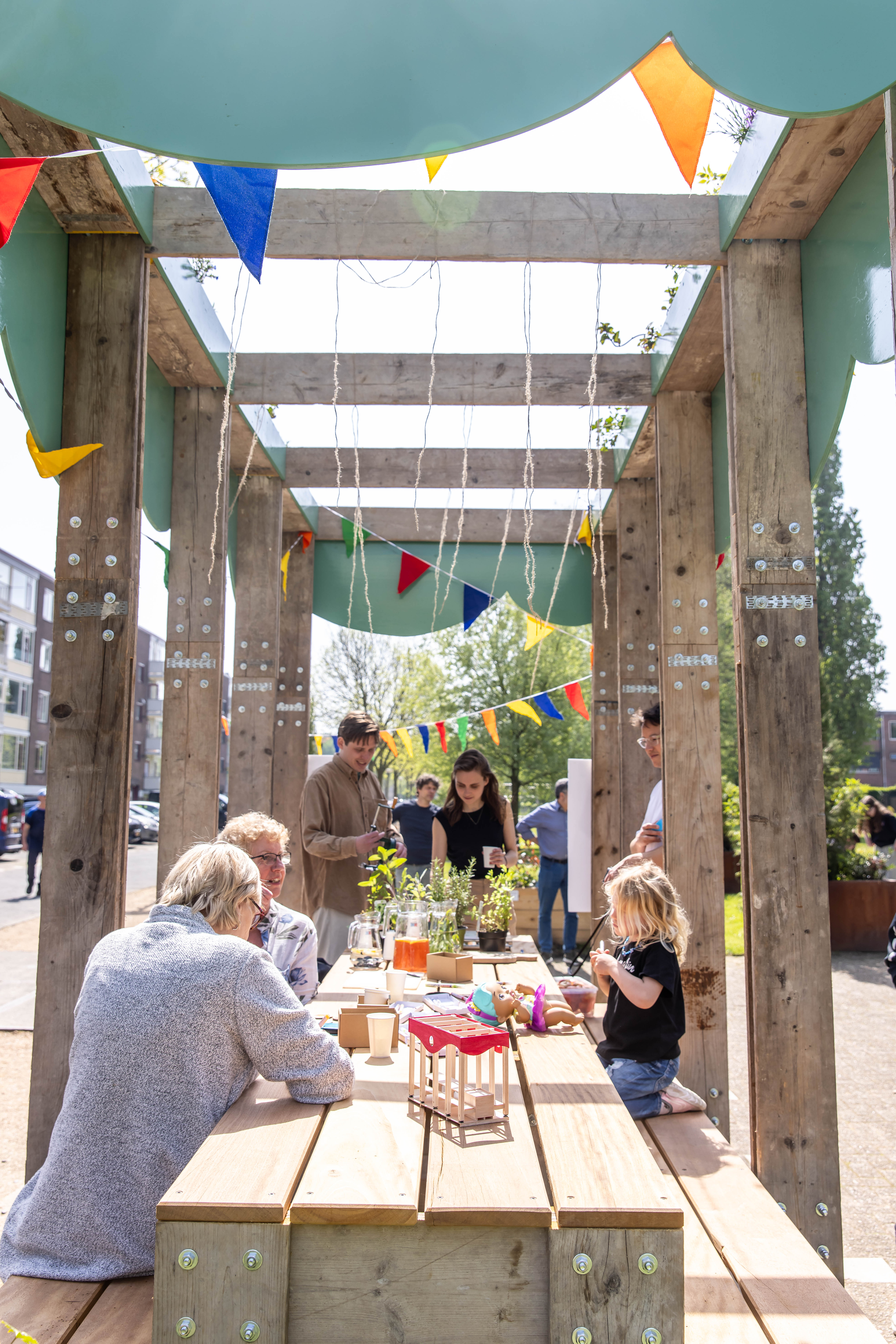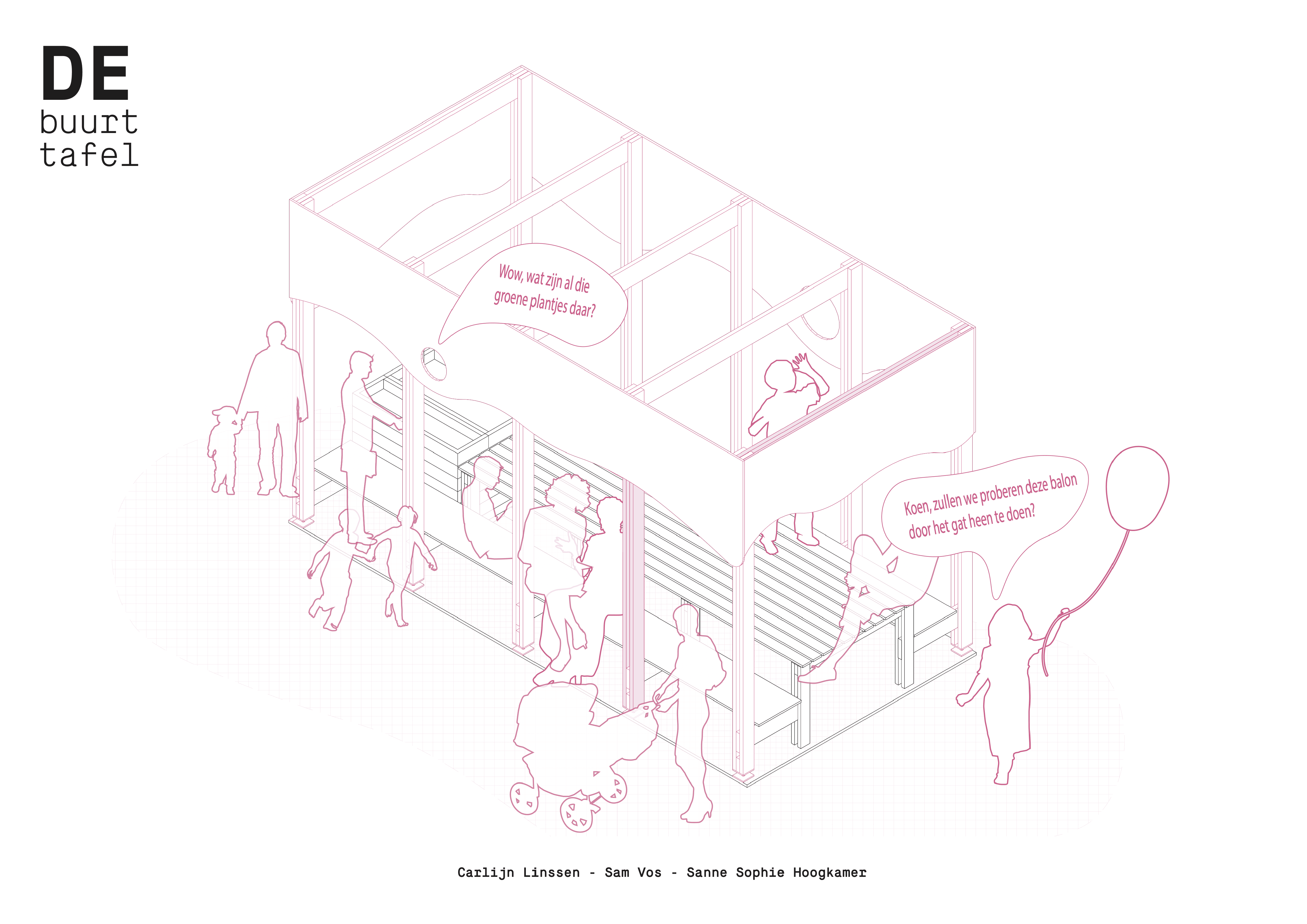 Er werden twee Buurttafels gemaakt van hergebruikte materialen. De tafels vormen een herkenbare plek in de wijk en nodigen uit om aan te schuiven. Eten, smaken en geuren brengen mensen samen, en dat staat hier centraal. Onderdeel van de tafel is een wormenhotel, waar groente- en fruitafval verzameld kan worden en langzaam verandert in nieuwe grond. Zo laat de tafel niet alleen ontmoeting zien, maar ook hoe omgaan met materiaal en afval anders kan. De samenwerking tussen Era Contour, het ontwerpteam, Buurman en Studio Klinkenberg maakte het mogelijk om van een parkeerplek een plek voor samen zijn te maken.
