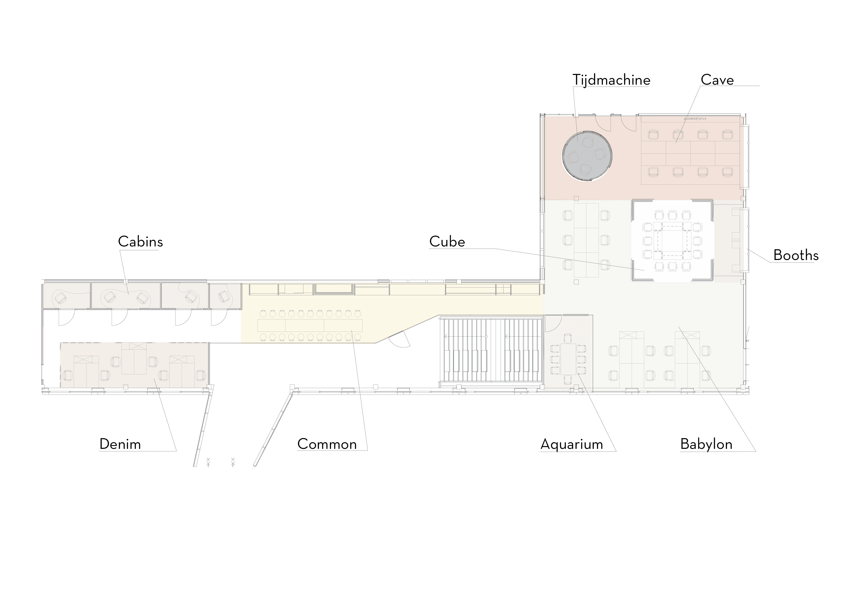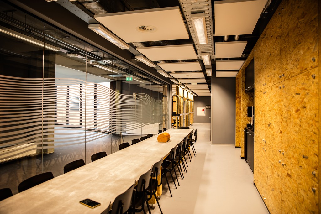 Het kantoor bestaat nu uit negen verschillende werksferen, elk met een eigen karakter en concentratieniveau. Er is een open ruimte die fungeert als creatief oplaadpunt, afgewisseld met één-persoonsruimtes voor focus, lange tafels voor samenwerking, grotere vergaderruimtes en plekken voor één-op-één gesprekken. Elke zone heeft een eigen thema en herkenbare uitstraling.