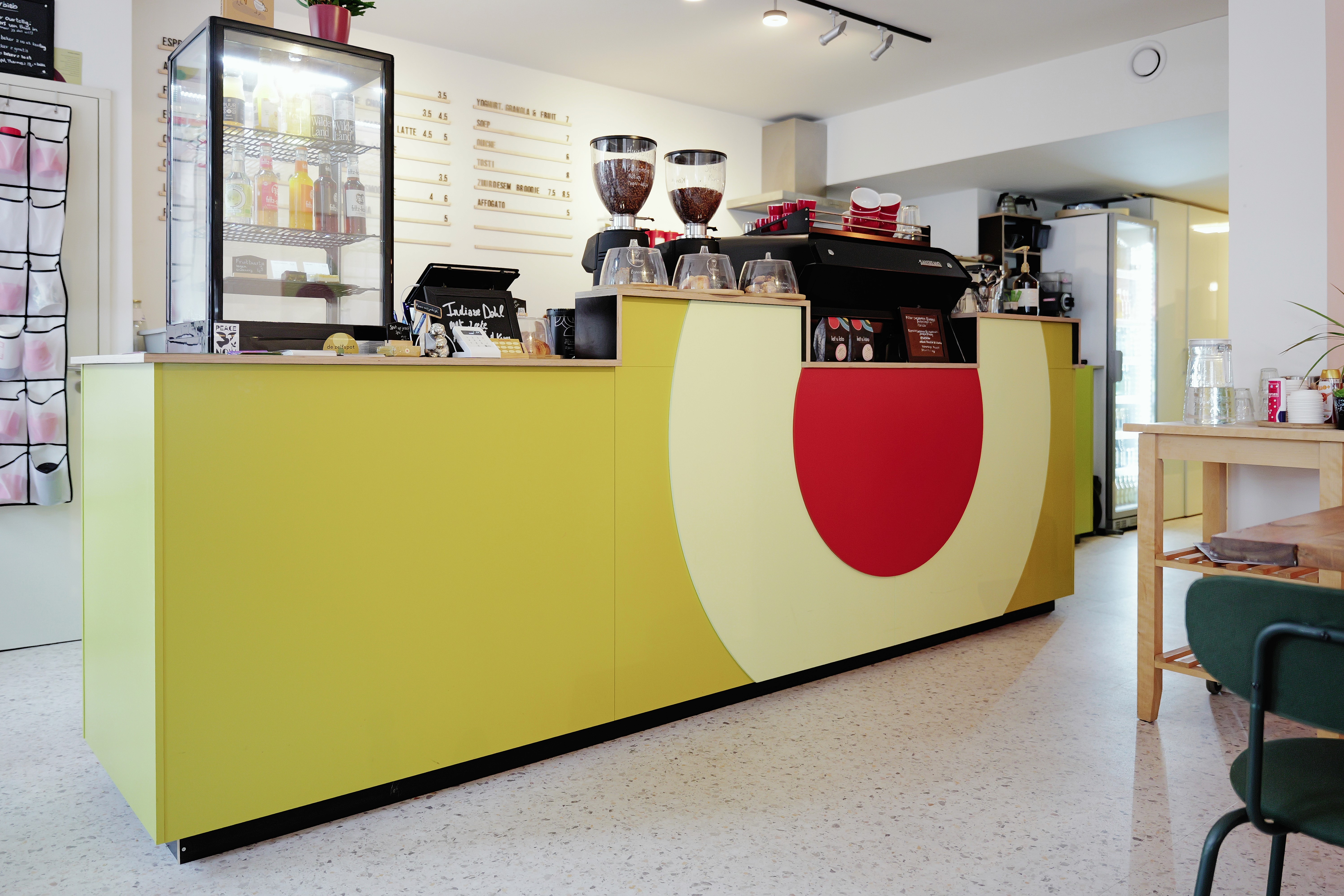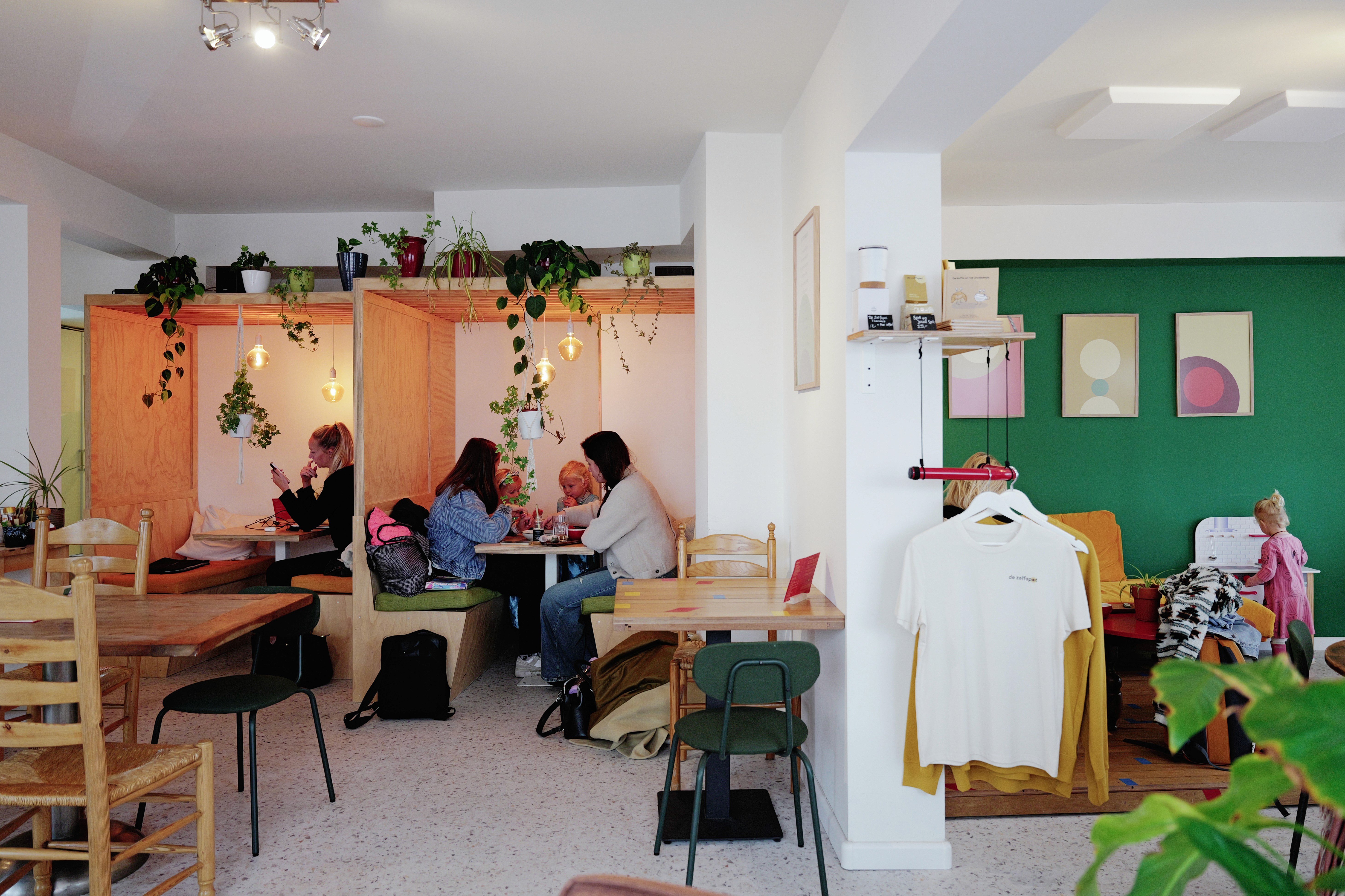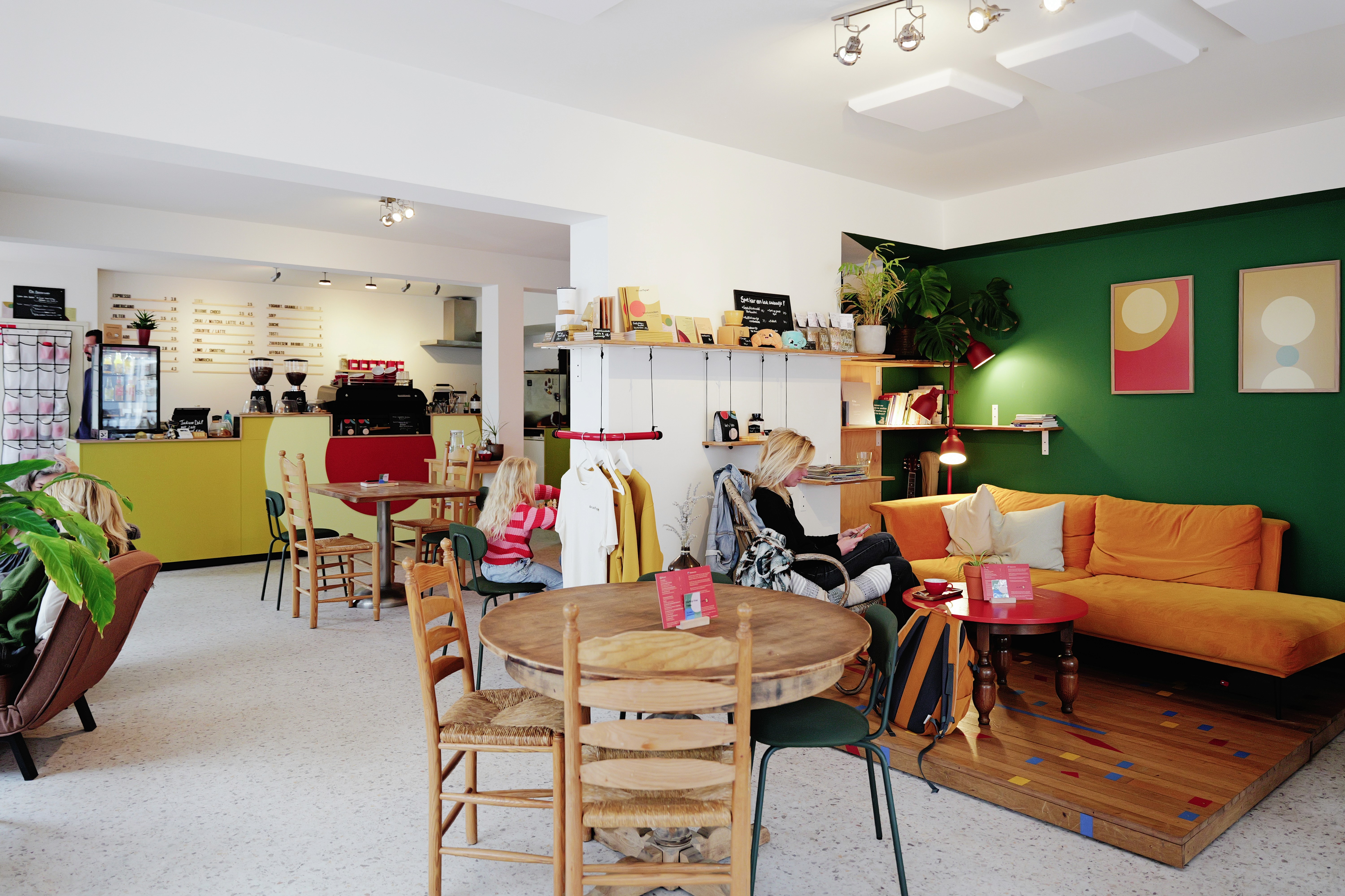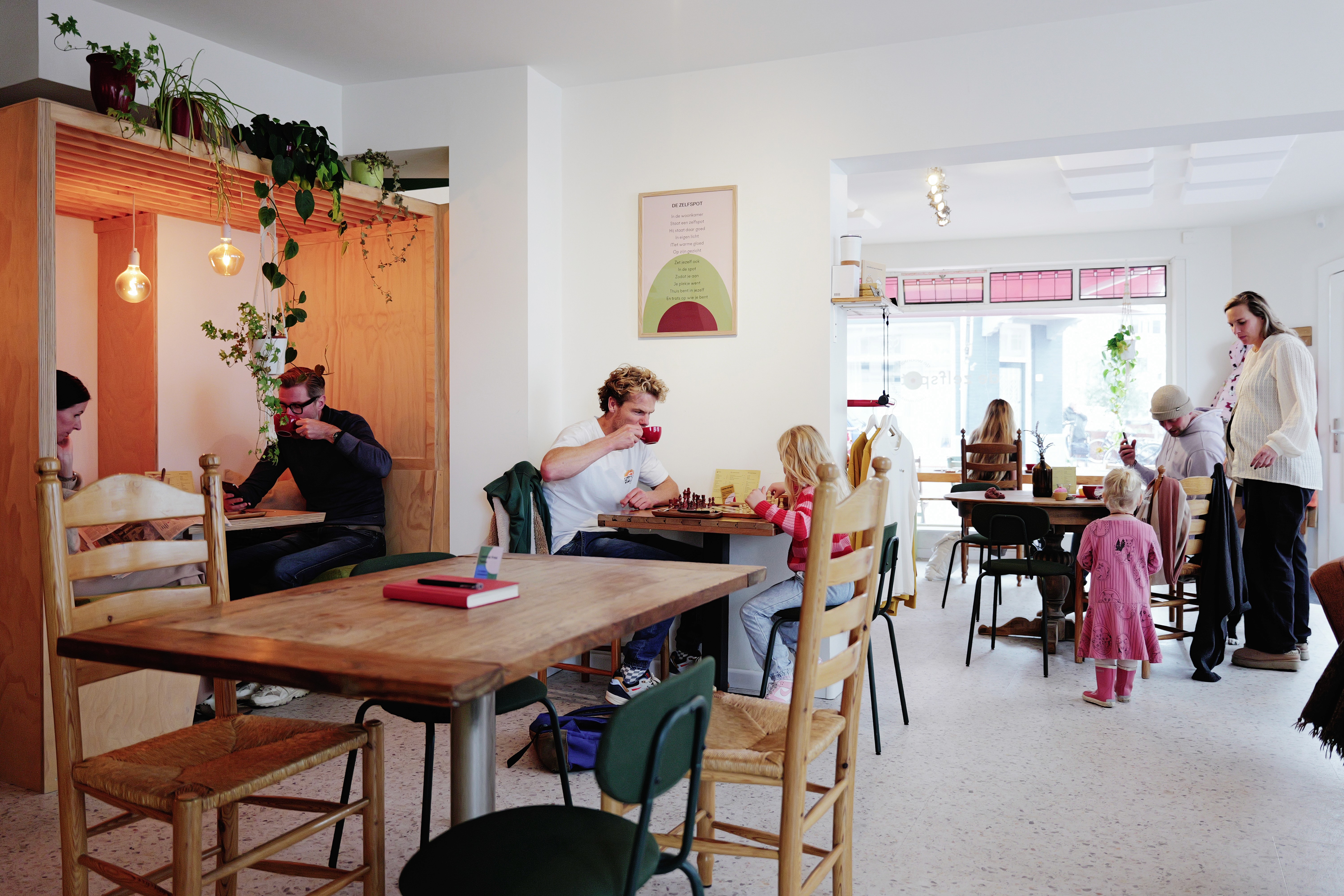 Achterin ligt een studio voor yoga, workshops en coaching. De bar staat centraal, recht tegenover de entree en precies tussen het café en de activiteitenruimte in. Zo verbindt hij alles en iedereen die binnenkomt — zonder dat het ooit te serieus wordt.