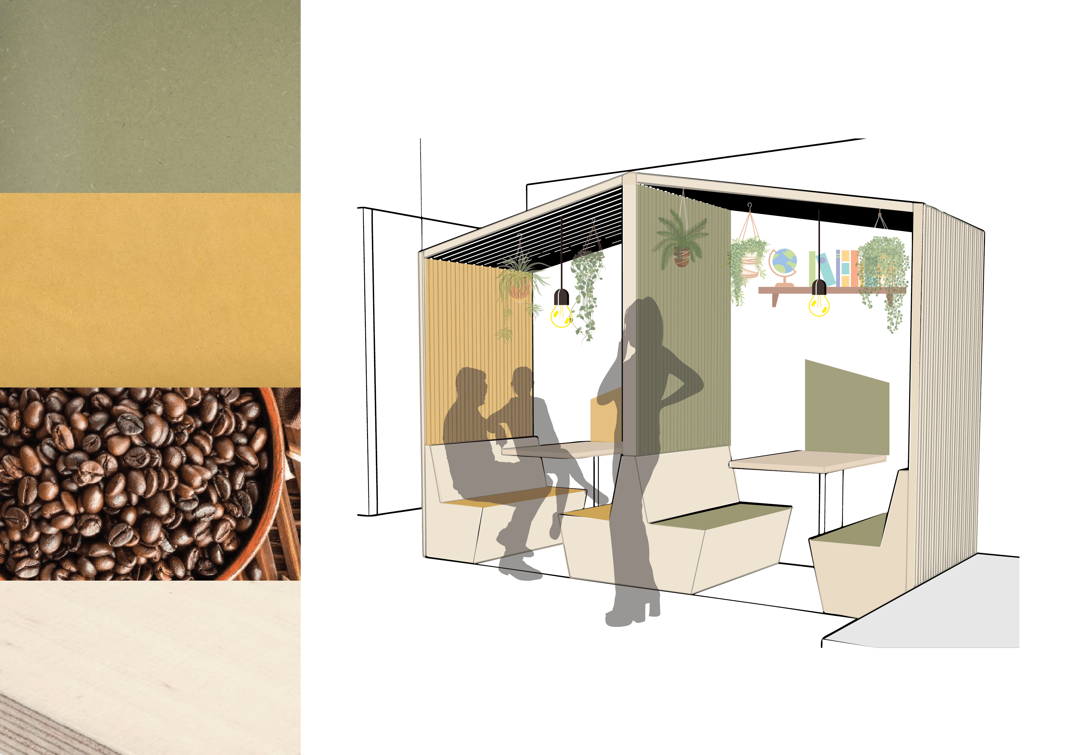 De ruimte is opgebouwd uit verschillende sferen die samen één geheel vormen. Er zijn meer besloten plekken voor één-op-één gesprekken, een lange leestafel voor ontmoeten en praten, en een huiskamersetting met banken waar je makkelijk blijft zitten. Losse tafeltjes nodigen voorbijgangers uit om even aan te schuiven, terwijl er ook werkplekken zijn voor wie met een laptop komt.