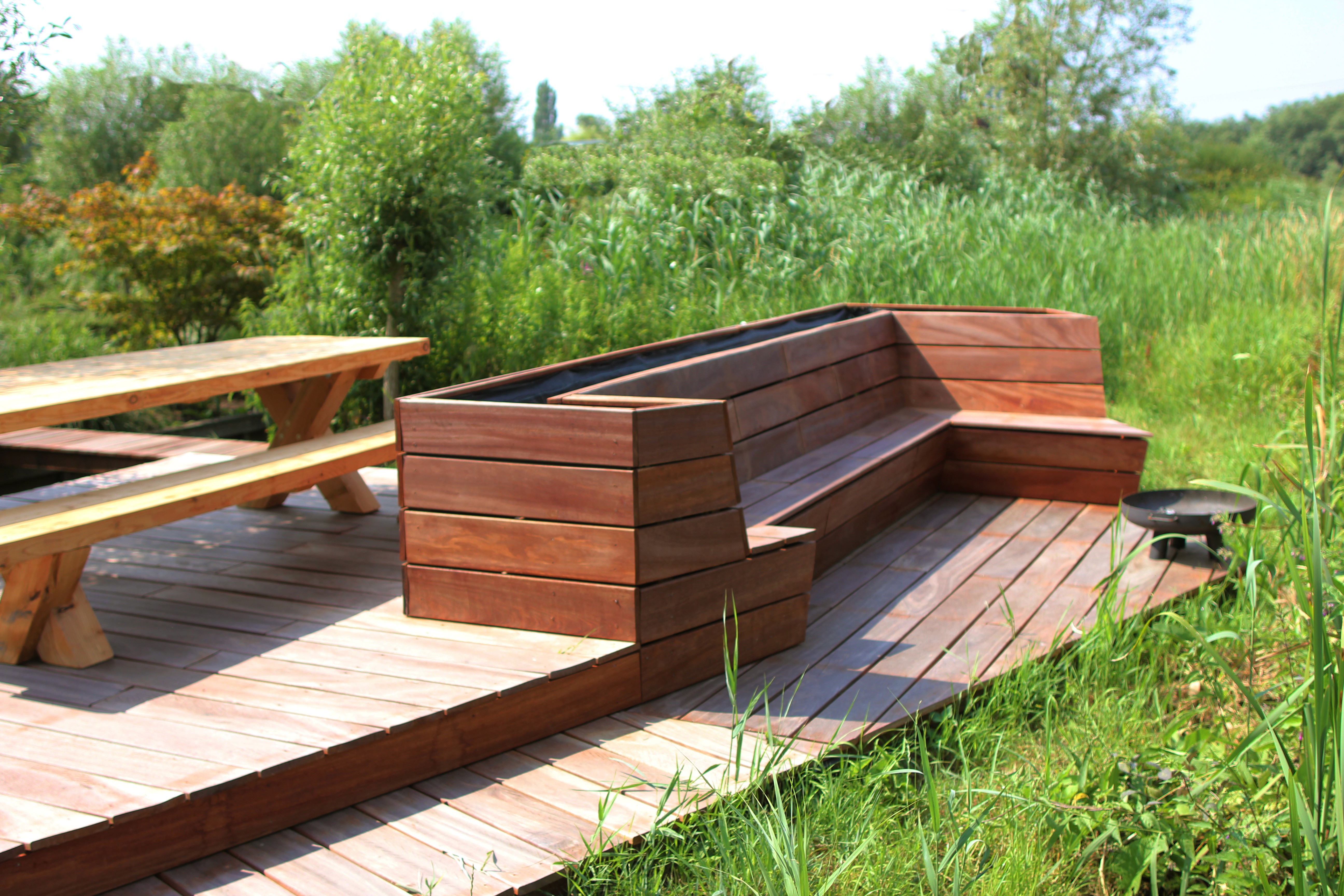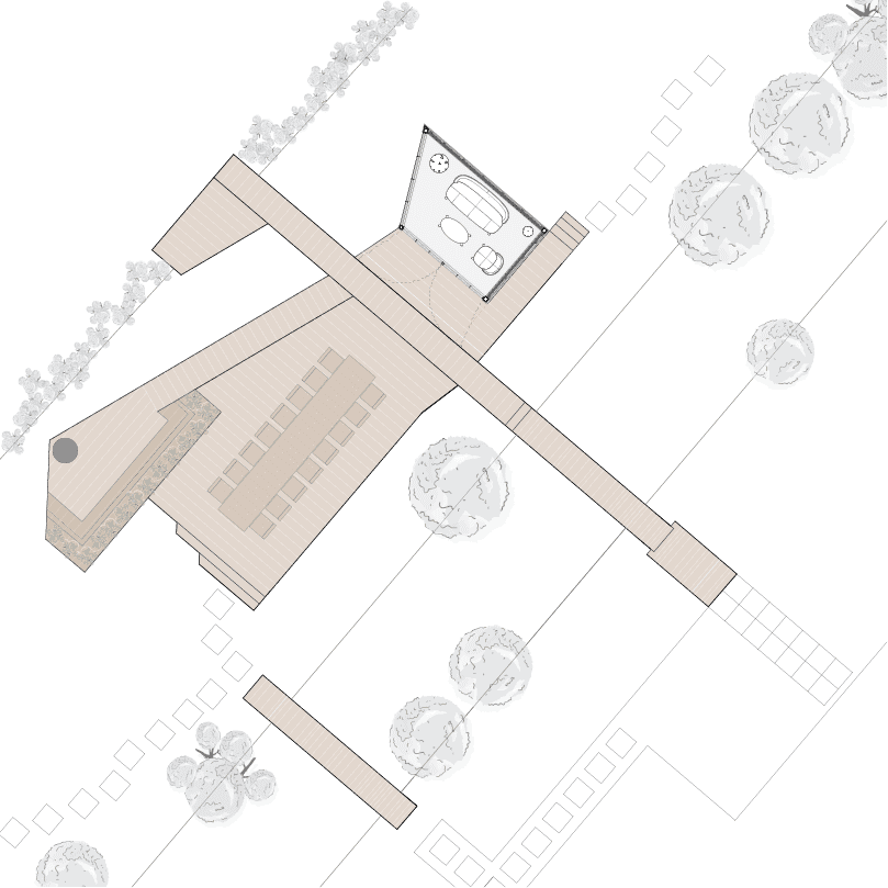 Onderweg ontstond ook het idee om de vlonder niet als één vlak te maken, maar in verschillende hoogtes en richtingen. Dat gaf lucht, speelsheid, en maakte het makkelijker om intieme en open plekken af te wisselen.