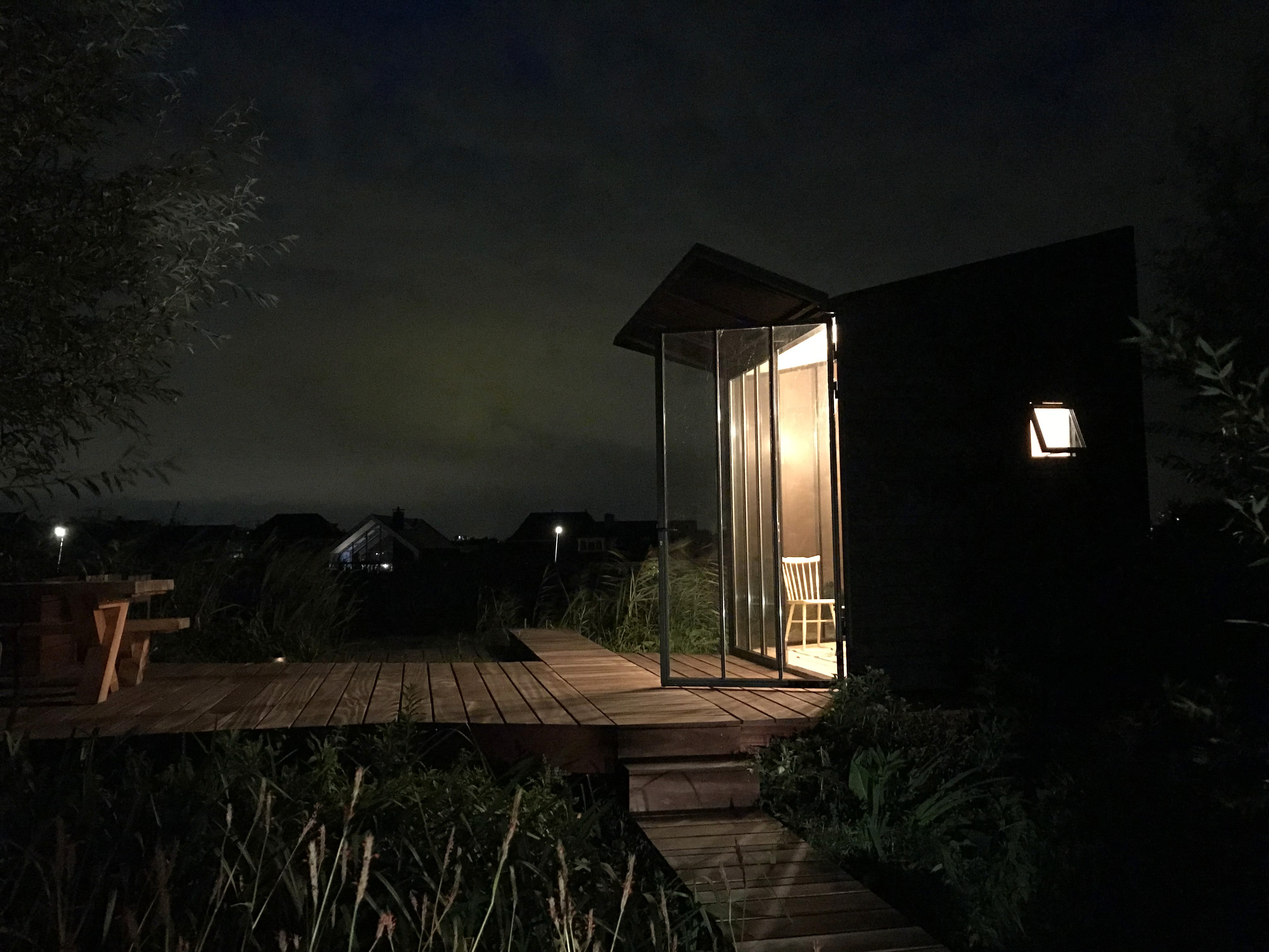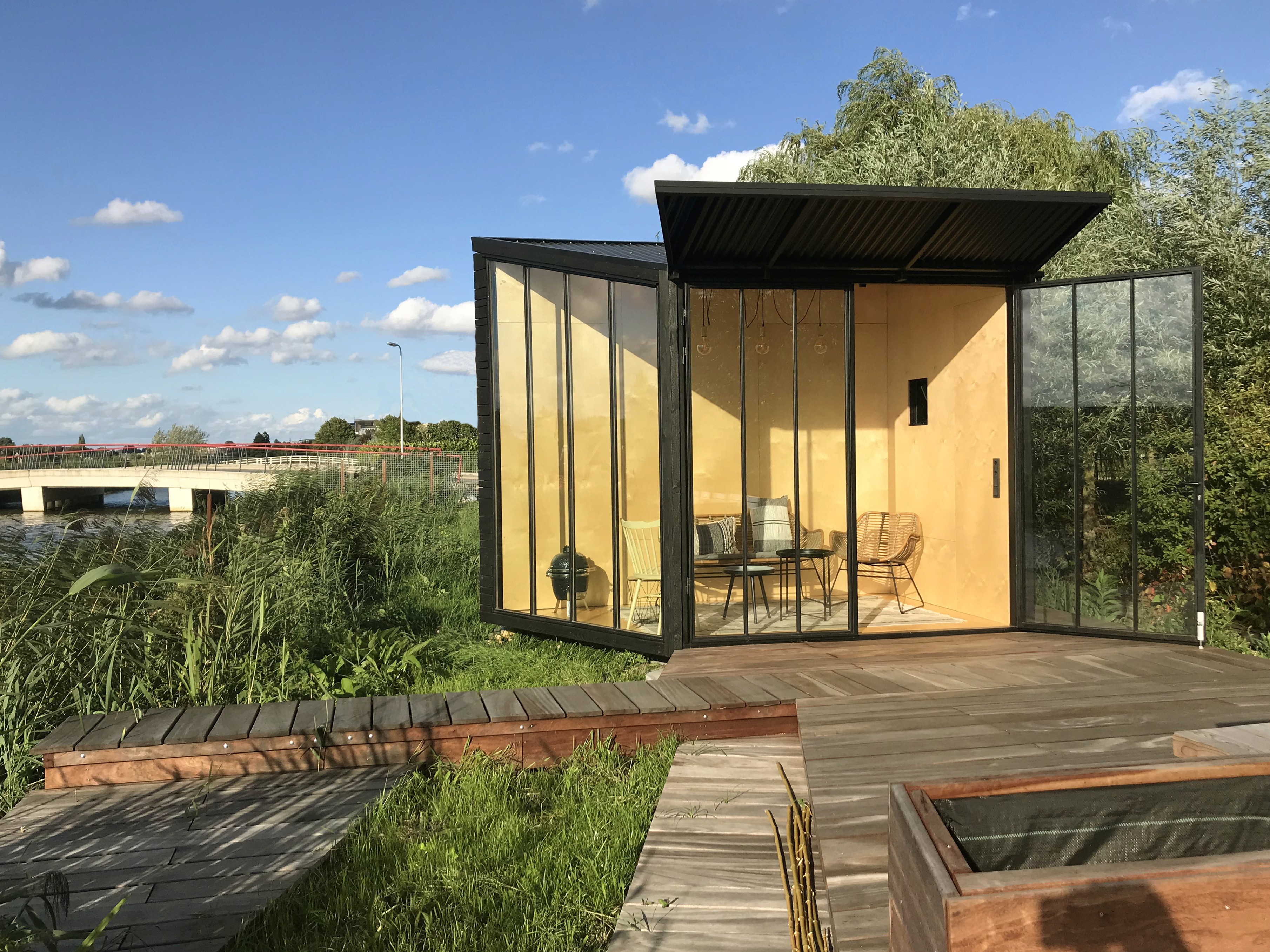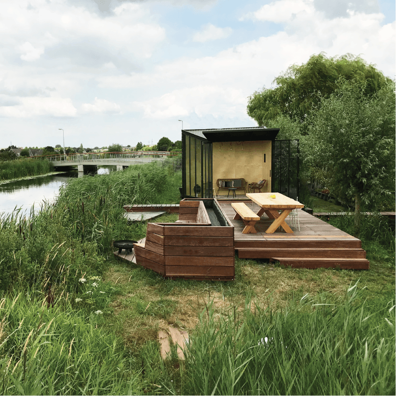 Het paviljoen opent zich nu vanzelf naar de zon en het water. Binnen, buiten en half-buiten lopen als een soort zachte overgang in elkaar over, met de lange eettafel als rustige as. De verlaagde zithoek met vuurplaats voelt door het riet en groen in de rugleuning als een kleine kuil waar je beschut tot rust komt.
