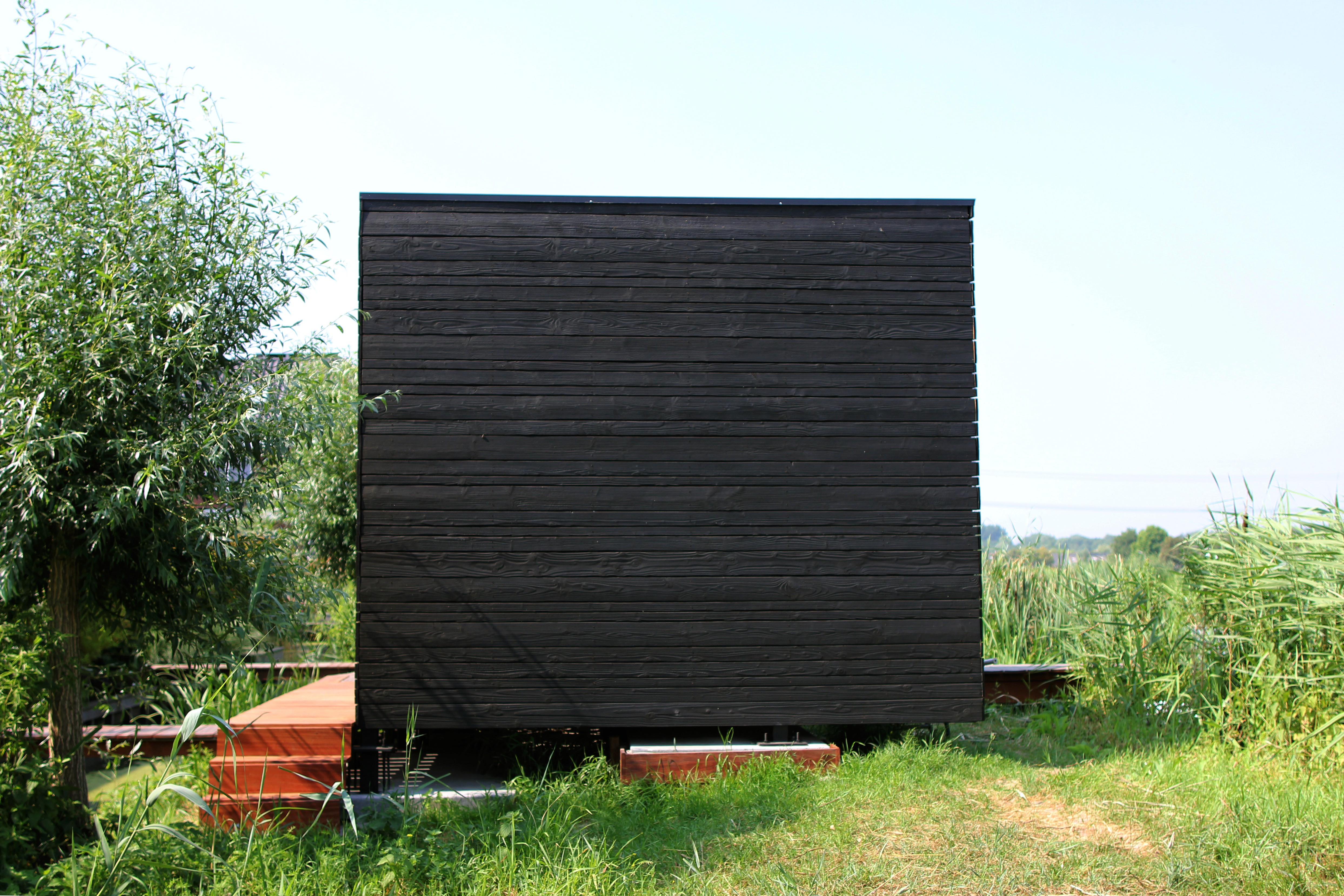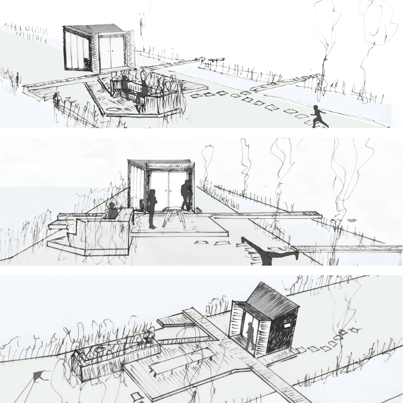 Samen met de familie zijn we over de dijk gelopen om te voelen waar licht, wind en uitzicht het fijnst samenkomen. Dat was al snel duidelijk: richting het water, met de middag- en avondzon recht op de gevel. Tegelijk moest het paviljoen zich afsluiten van de weg erachter. Flexibiliteit werd een basisvoorwaarde. We kozen daarom voor een volledig te takelen paviljoen en een vlonder die is opgedeeld in losse segmenten—iedere zone makkelijk te demonteren als het Hoogheemraadschap weer langskomt.