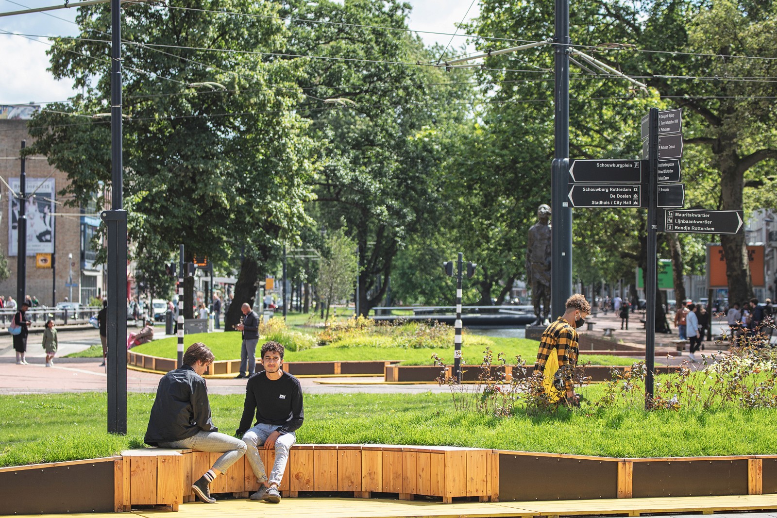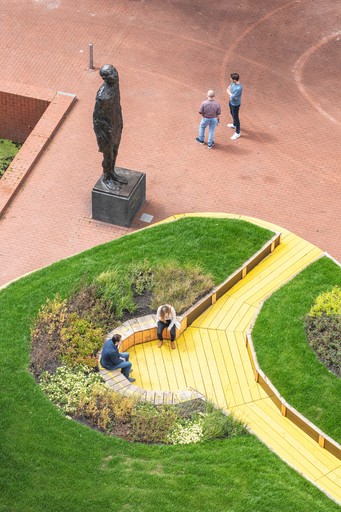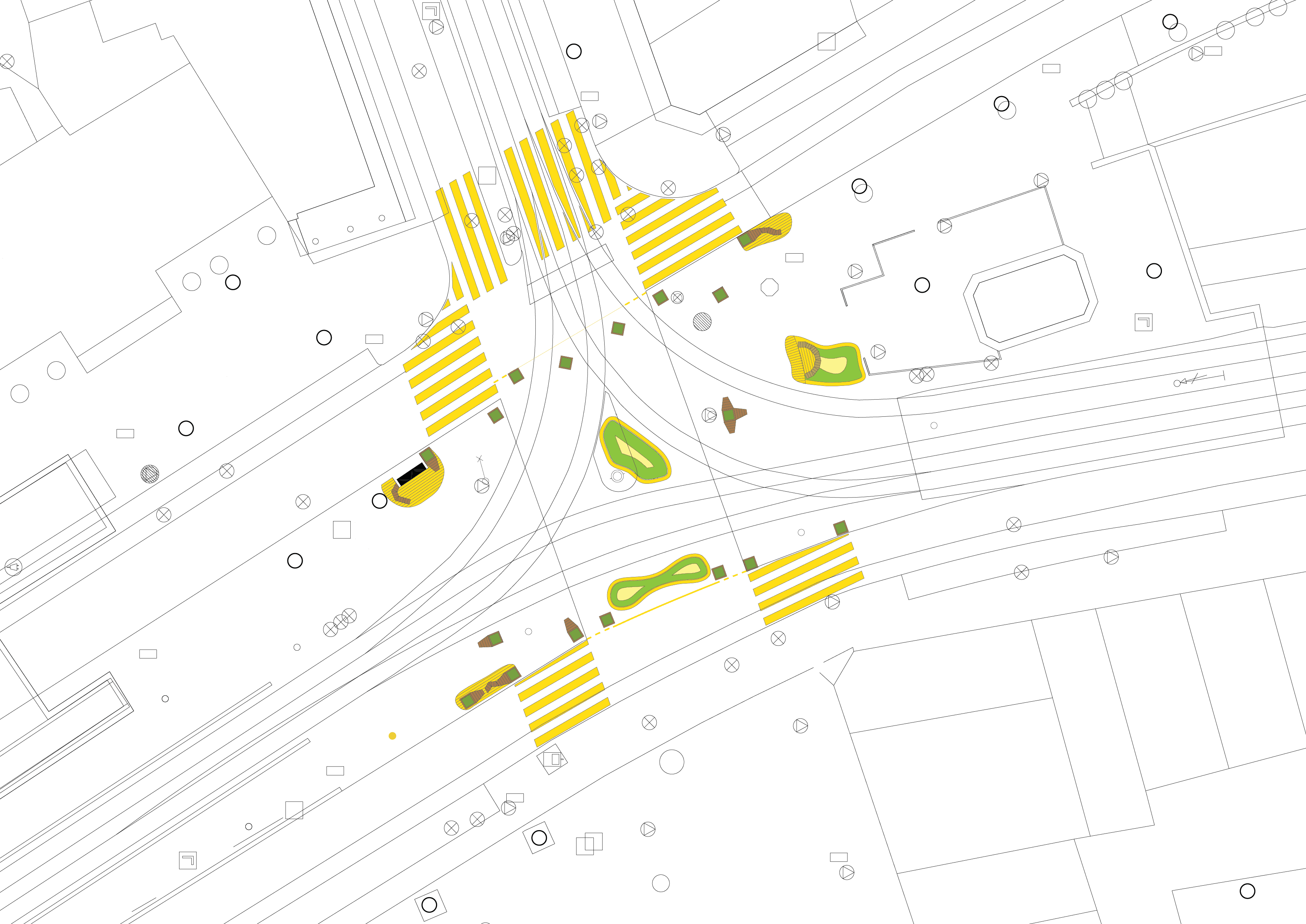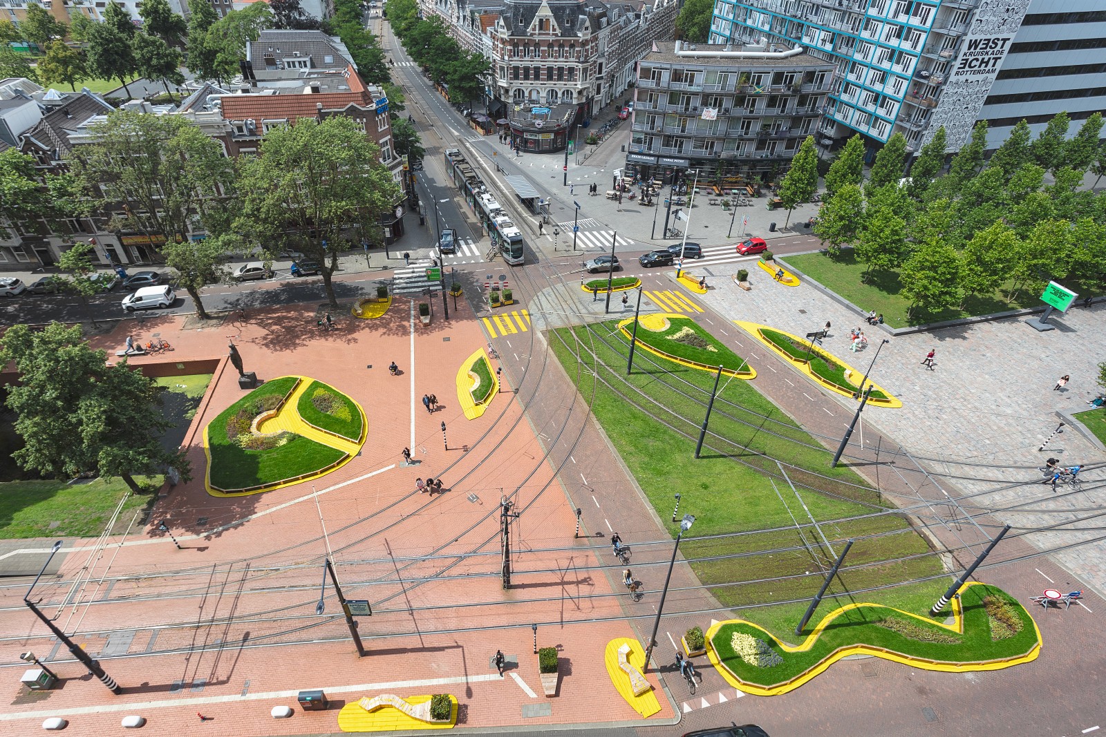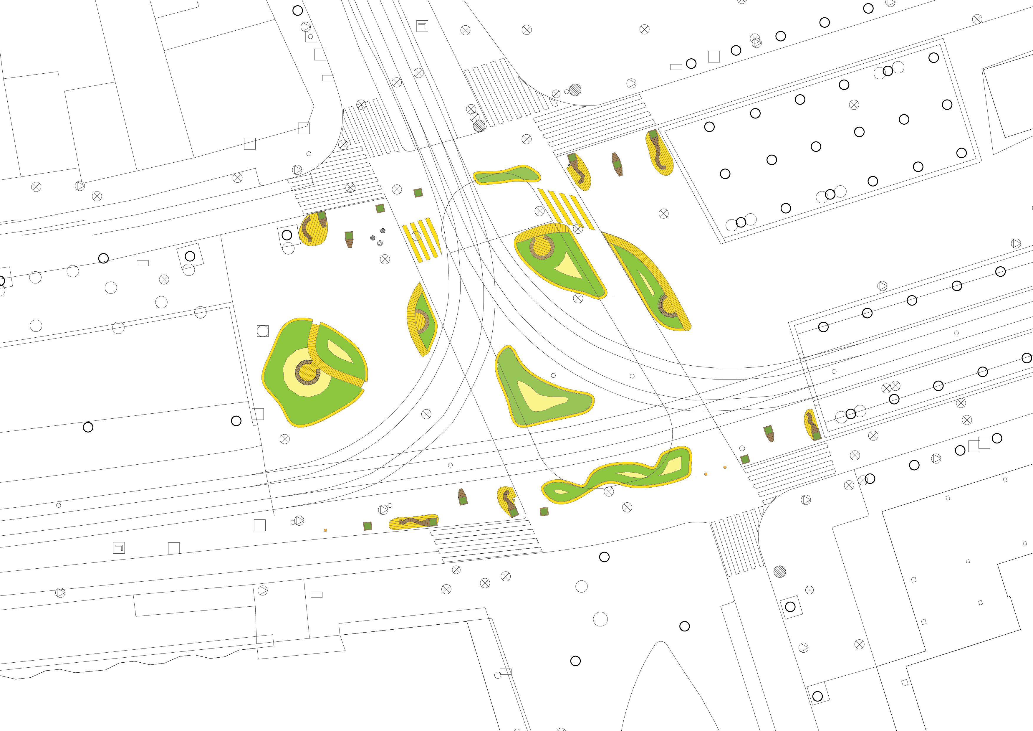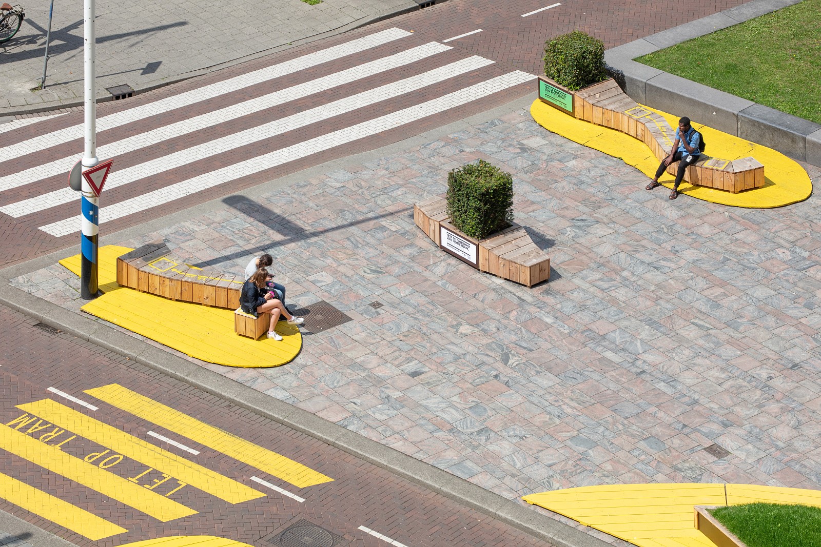 Uiteindelijk veranderden de twee verkeerspleinen in een landschap van 1400 m² dat volledig is ingericht op de menselijke maat. Gele organische vlonders leidden voetgangers en fietsers als vanzelf over de pleinen. Tussen de zitplekken, graspockets en kleine bloemrijke heuvels ontstonden plekken waar mensen even konden landen. De gele zebrapaden en opvallende vormen trokken je letterlijk uit de oude situatie; je voelde meteen dat je hier als mens welkom was.