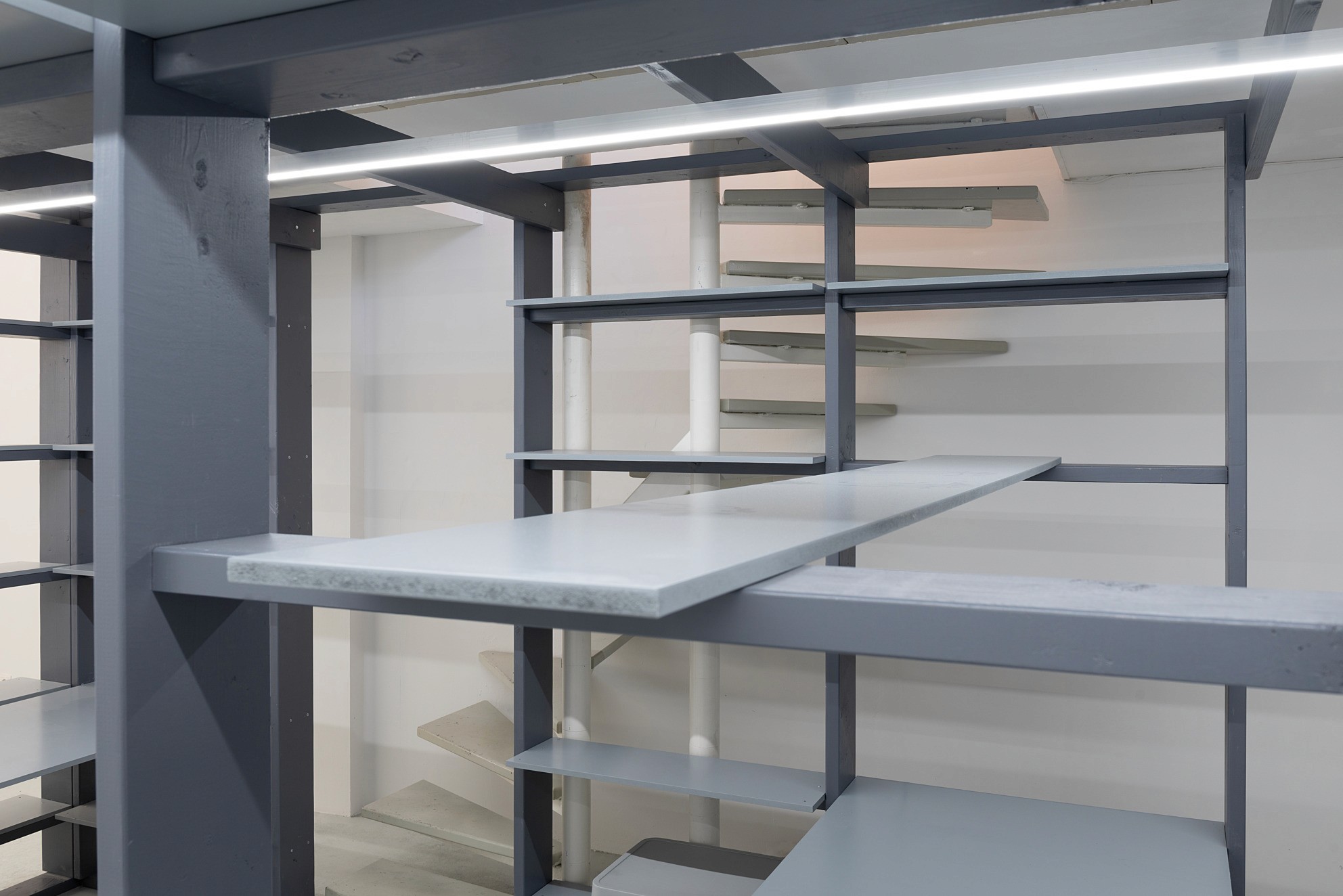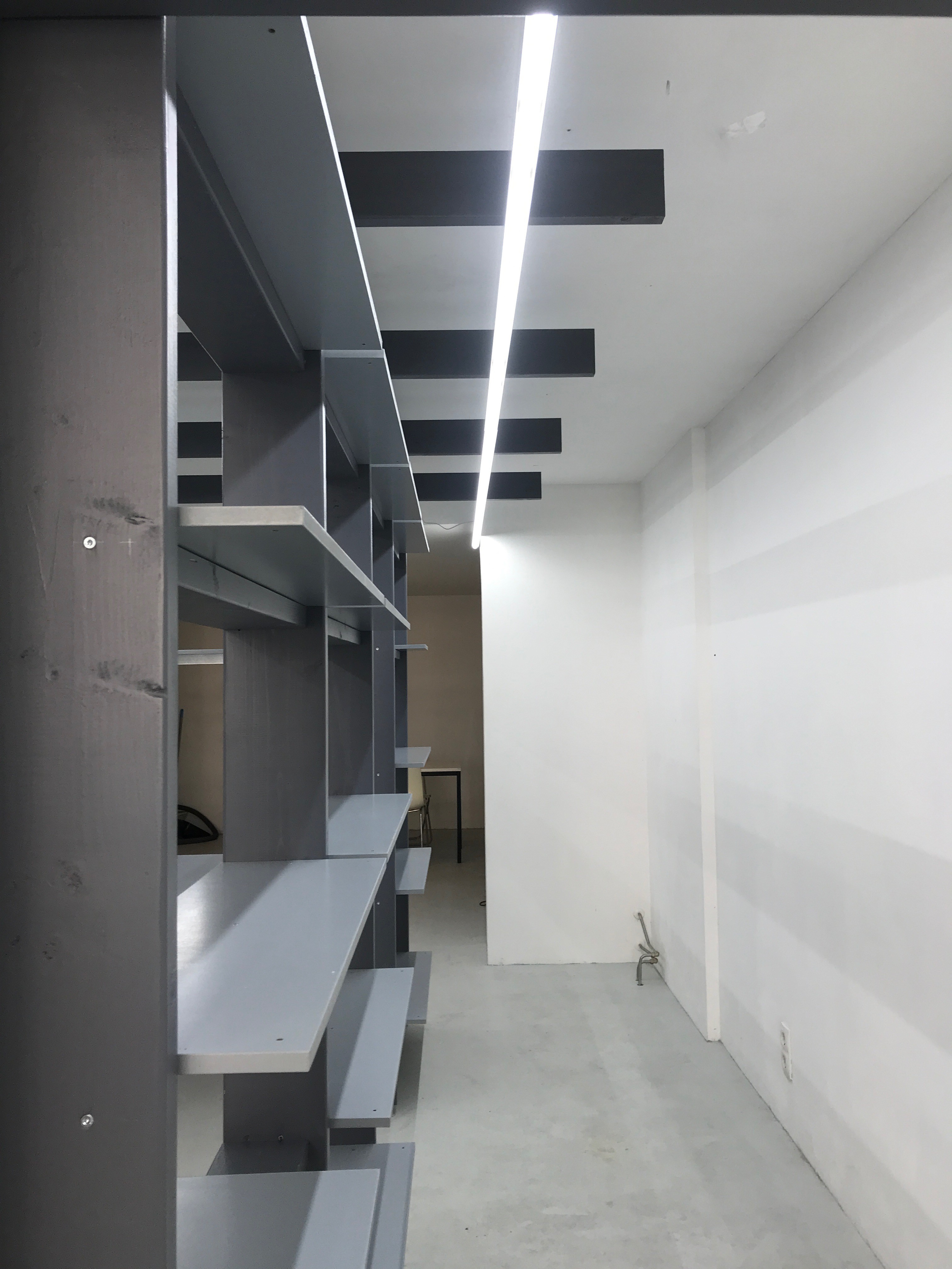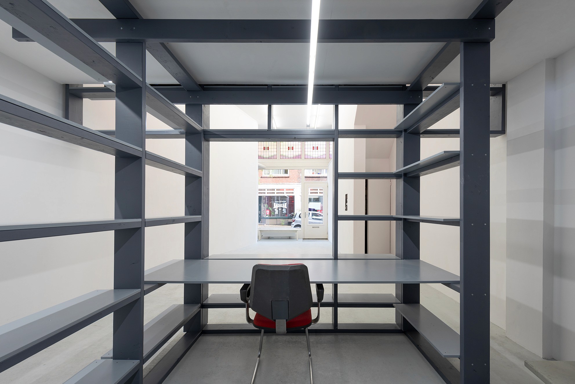 De installatie bestaat uit een structuur van vuren balken die op verschillende manieren gebruikt kan worden. Legplanken, bureaubladen en expositiepanelen kunnen erin worden geplaatst en weer worden weggehaald. Zo verandert de galerie mee met wat er getoond of gedaan wordt.