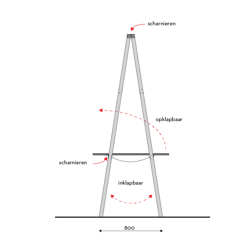 De presentatiestandaard bestaat uit een houten staander met een uitklapbaar blad. Dat blad biedt ruimte om producten te tonen of een scherm neer te zetten. Daarnaast is er plek om posters tot A1-formaat op te hangen. De standaard is uitgevoerd in vurenhout en voelt stevig, maar blijft licht en handzaam. Zo ondersteunt hij verschillende manieren van presenteren, zonder het proces in de weg te zitten.