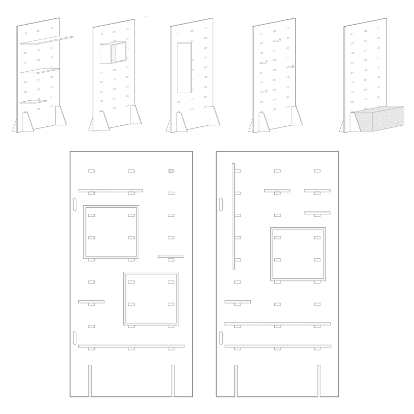 Het resultaat is een set panelen van populierenhout, licht en toch stabiel. Elk paneel is 900 mm breed en 2000 mm hoog, met drie rijen gaten waarin planken, kaders, hangers of boxen eenvoudig kunnen worden geplaatst en vastgezet. De voetstukken kunnen eraf geschoven worden en speciale handgrepen zorgen dat de panelen makkelijk te verplaatsen zijn. Zo kunnen studenten en docenten zelf bepalen hoe de presentaties eruitzien. Het meubel voelt daardoor niet alleen praktisch, maar nodigt ook uit om te experimenteren en dingen te verplaatsen.