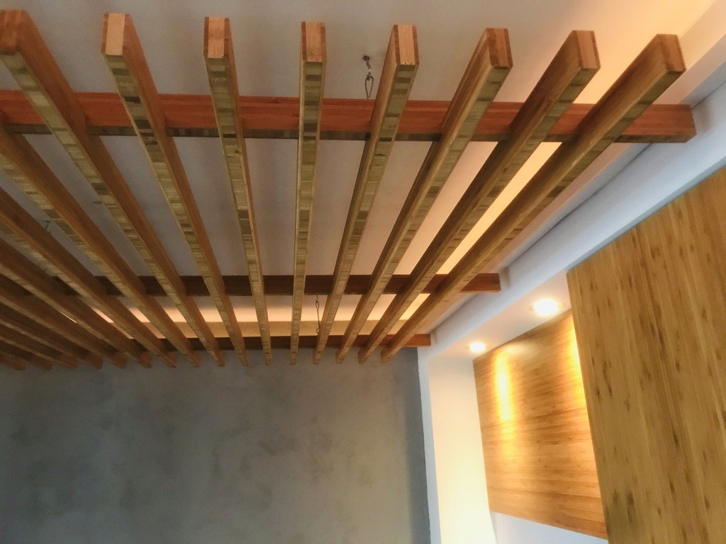 De tatami ligt nu ingesloten tussen twee muren, met een open zijde en een semi-transparante scheiding. Verticale bamboe lamellen markeren de overgang tussen de woonruimte en de tatami-plek. Ze zorgen voor afscheiding, maar laten licht en contact toe. Aan het plafond verzachten dunne bamboe lamellen het kunstlicht, dat diffuus op de tatamimat valt.